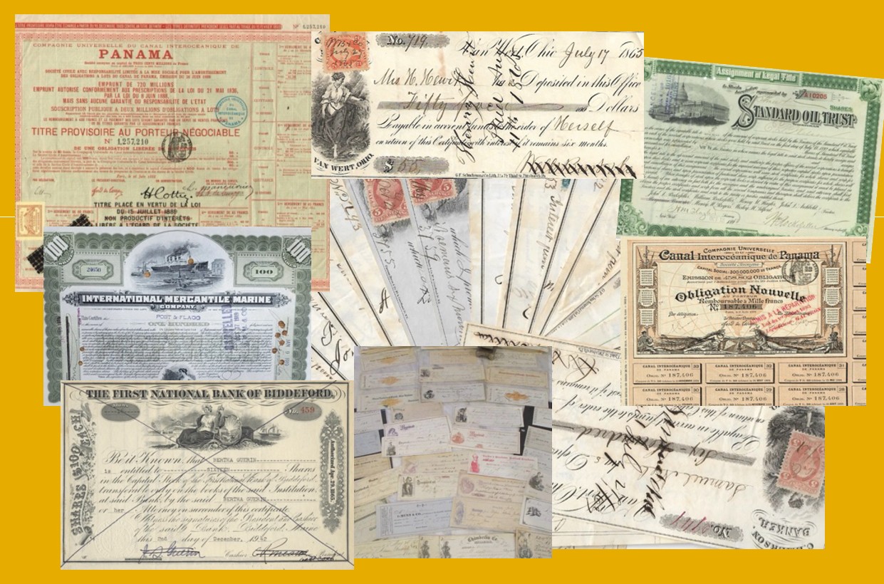 We have a large amount of scripophilic interest = old financial documents, share certificates and cheques. About 15,000 old share certificates and checks make up one of Norway's largest collections. From known and unknown historical companies and situations from all over the world. Including early issues from: Panama Canal, Ford Company, Standard Oil, Volvo. Fantastic works of art. Many with a sharp rise in value and increasing international collector interest.