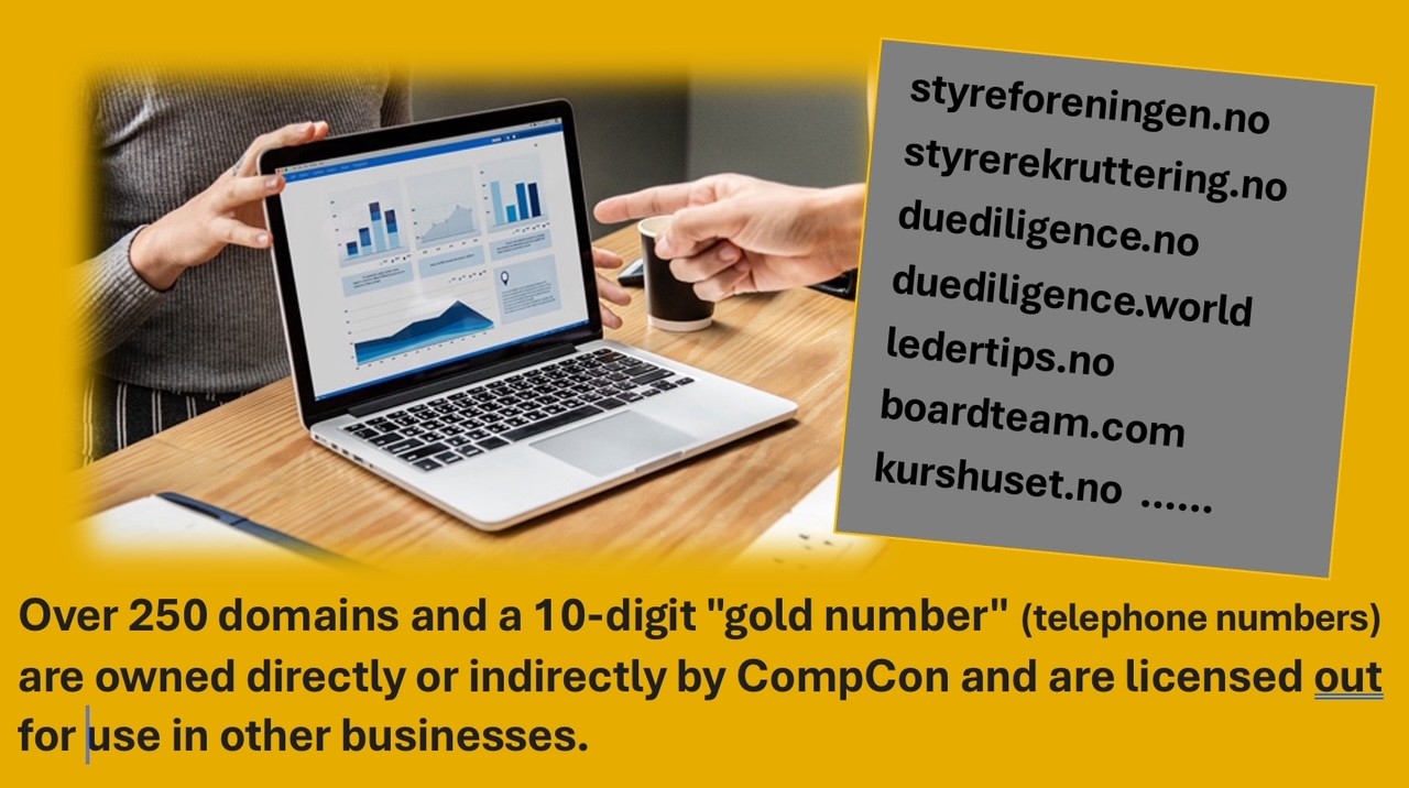 Over 250 domains are owned by CompCon and associated companies, including around 30 of these are licensed out to other companies or business concepts where several are - or are in the process of becoming - registered trademarks or parts of patented processes or products. CompCon is also the owner of a 10-digit "gold number" (telephone number) which is licensed out.